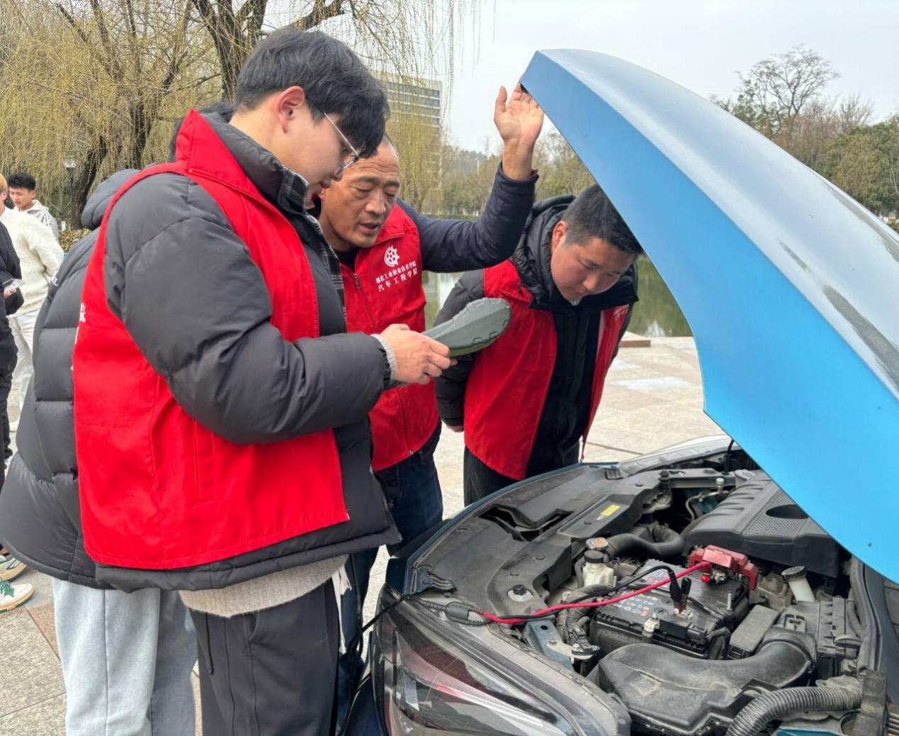 在校园慧智广场上的志愿服务公益集市中,十余名“飞驰青春”志愿服务队的同学在刘德涛老师的指导下进行车辆检测项目展示,对汽车发动机、蓄电池健康状况和车轮轮胎安全状态进行检查,为学校老师提供爱车“体检”和预约洗车登记服务,并于3月7日和8日义务帮助老师们清洗了车辆。实训车间内,学生会干事们对实训车辆、台架、桌椅、门窗、地面及车间周边环境进行了深度清洁整理。经过同学们的共同努力,实训车间及周边呈现出干净整洁的崭新面貌,营造了良好的教学环境。