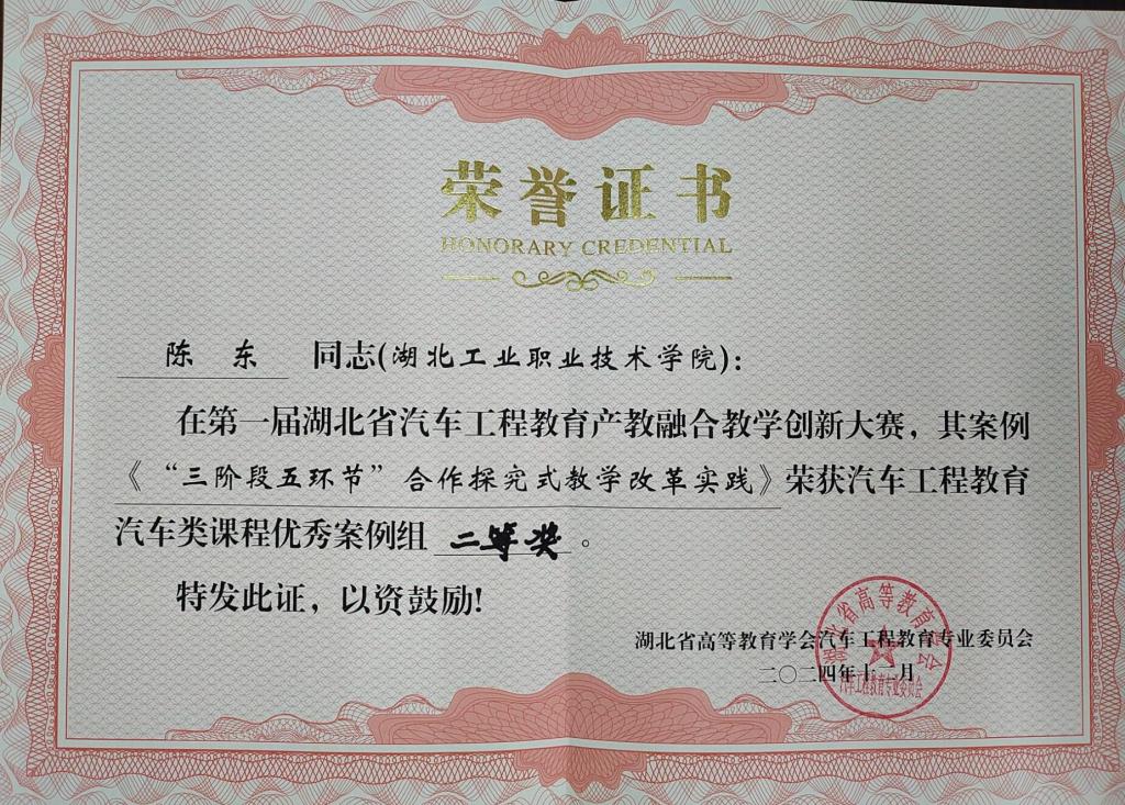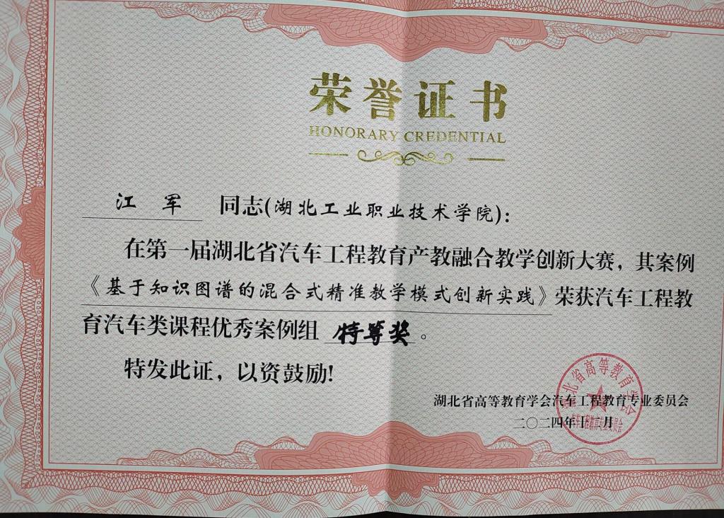 (通讯员张健)11月30日至12月1日,湖北省高等教育学会汽车工程教育专业委员会2024年年会在武汉理工大学举行,同期举办了首届湖北省汽车工程教育产教融合教学创新大赛,在大赛中,开元官网KY开元集团官网入口江军老师的《基于知识图谱的混合式精准教学模式创新实践》荣获汽车工程教育汽车类课程优秀案例特等奖,陈东老师的《“三阶段五环节”合作探究式教学改革实践》、赵锐老师的《追溯汽车之韵,传承文化之魂》荣获汽车工程教育汽车类课程优秀案例二等奖。