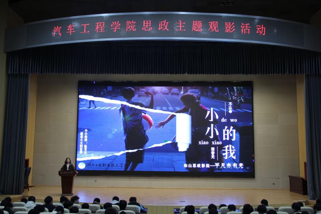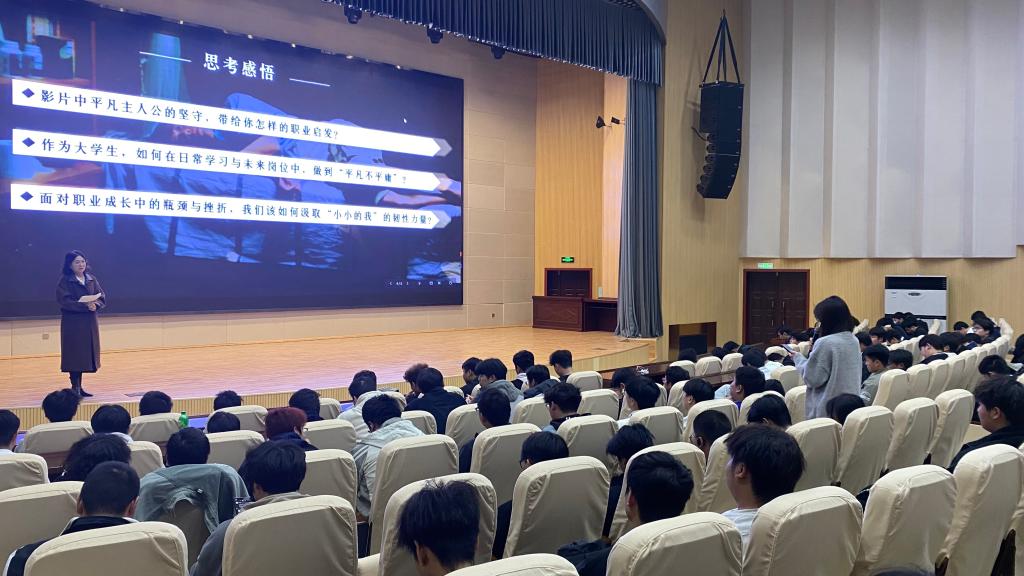 活动开始前,付莉老师作为主讲人开展“平凡亦有光”思政分享,引导同学们带着三个问题“影片中平凡主人公的坚守,带给你怎样的职业启发?”,“作为大学生,如何在日常学习与未来岗位中,做到‘平凡不平庸’?”和“面对职业成长中的瓶颈与挫折,我们该如何汲取‘小小的我’的韧性力量?”沉浸式观影,为后续的交流讨论埋下伏笔。