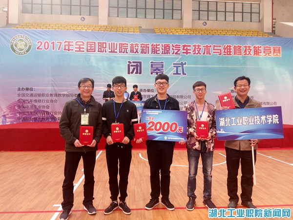 (通讯员 江军)近日,由全国交通运输职业教育教学指导委员会、汽车维修行业协会主办的“2017年全国职业院校新能源汽车技术与维修技能竞赛”在南京交通职业技术学院举行。大赛共有来自全国中、高职院校的51个代表队,共计254人参加。湖北工业职院代表队由汽车工程系赵艳杰、江军担任指导教师,新能源汽车技术专业学生刘欢、南江涛、徐斐参赛。最终,学院代表队喜获高职组团体二等奖的优异成绩。